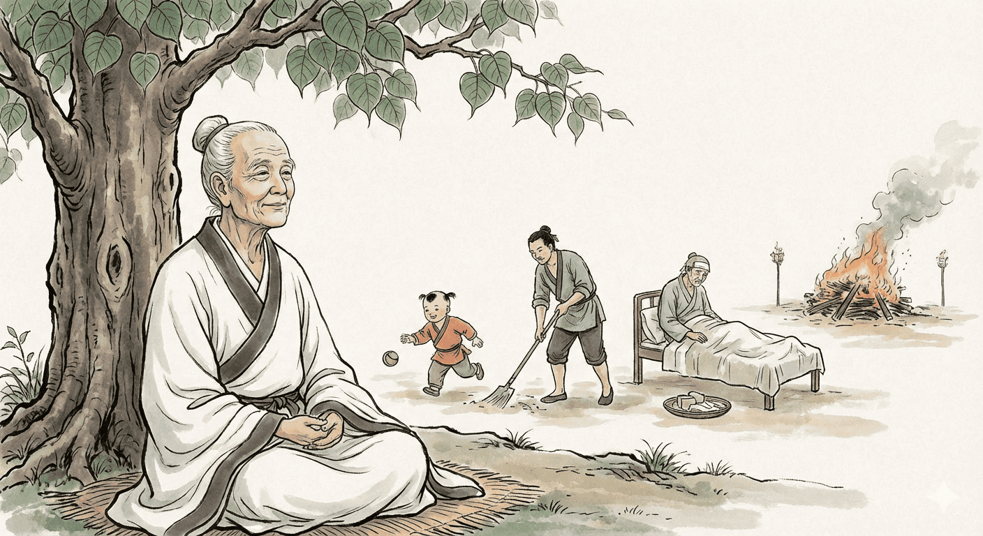 Hình ảnh minh họa một người đang bình thản quan sát các giai đoạn của cuộc đời: sinh, lão, bệnh, tử. Đây là sự nhìn nhận thực tế về “Khổ” (Dukkha) trong Phật giáo. Tuy nhiên, thái độ của người trong hình không phải là bi quan hay tuyệt vọng, mà là sự thấu hiểu và chấp nhận quy luật tự nhiên. Phật giáo không bi quan mà là thực tế, nó chỉ ra sự thật về khổ đau để từ đó tìm ra con đường giải thoát.